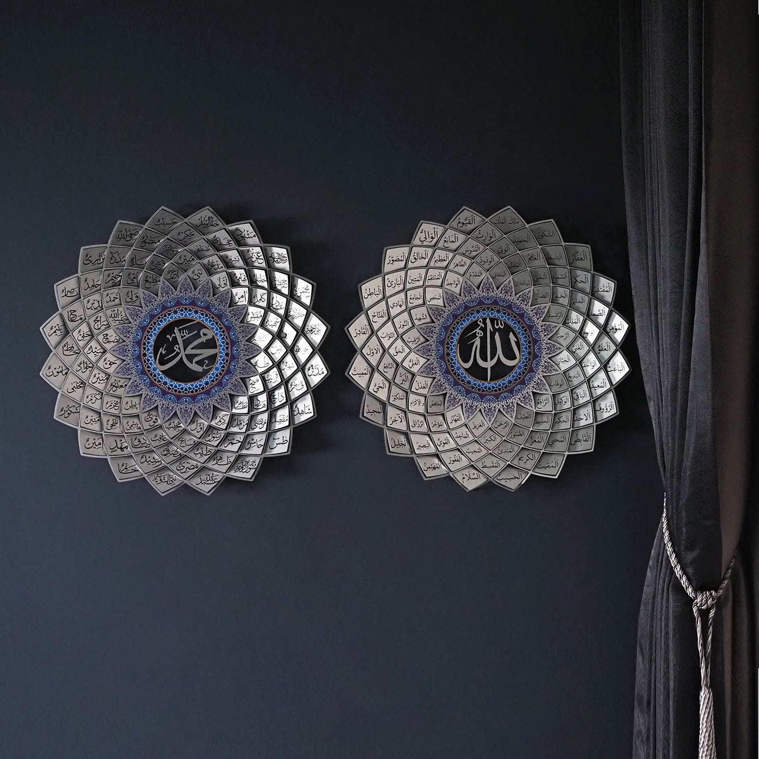 Two panels, one eternal message — embracing the 99 beautiful names of Allah and the beloved name of Prophet Muhammad in a unified set of devotion and elegance. Let them adorn your wall and turn a room into a space of reverence, reflection and faith.