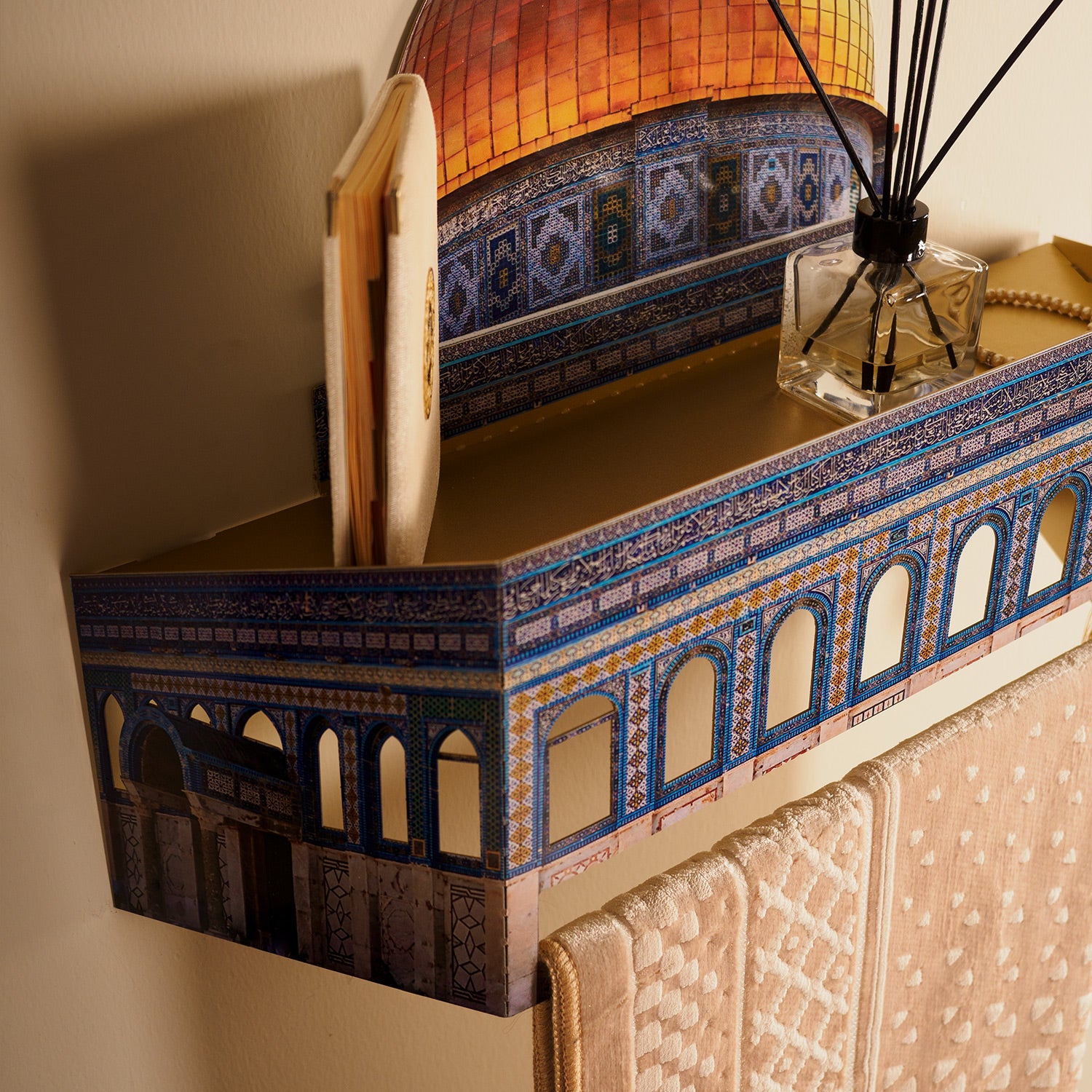 Bring reverence and elegance into your home — this 3D metal prayer-rug holder wall shelf featuring Al-Masjid Al-Aqsa design offers a beautiful, meaningful way to store your prayer rug and honor spiritual moments.