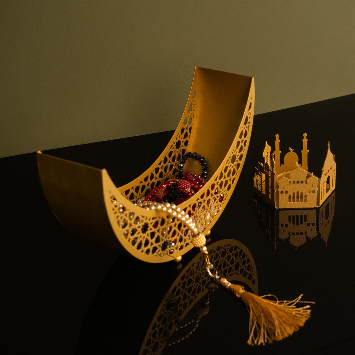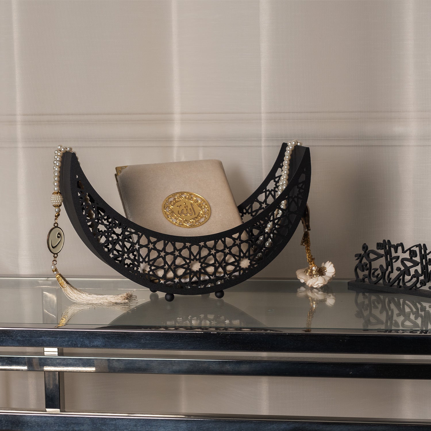 • Bring the serenity of Ramadan into your home — this crescent-moon shaped metal decor adds a subtle, spiritual elegance to any space, making it ideal for the holy month and beyond.