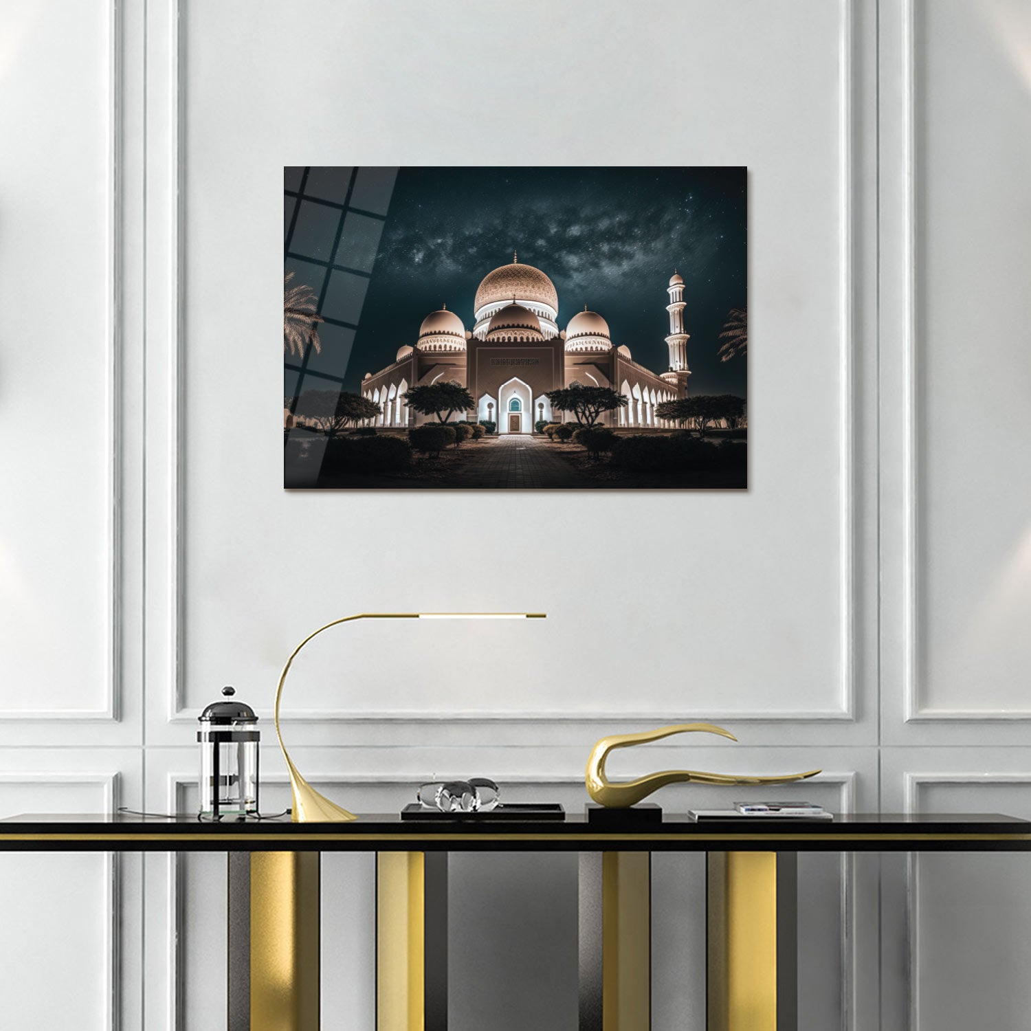 Inspired by the majestic Sheikh Zayed Grand Mosque, this artwork reflects the grace and harmony of Islamic architecture. A timeless piece that brings serenity, faith, and quiet spiritual elegance into your home.
