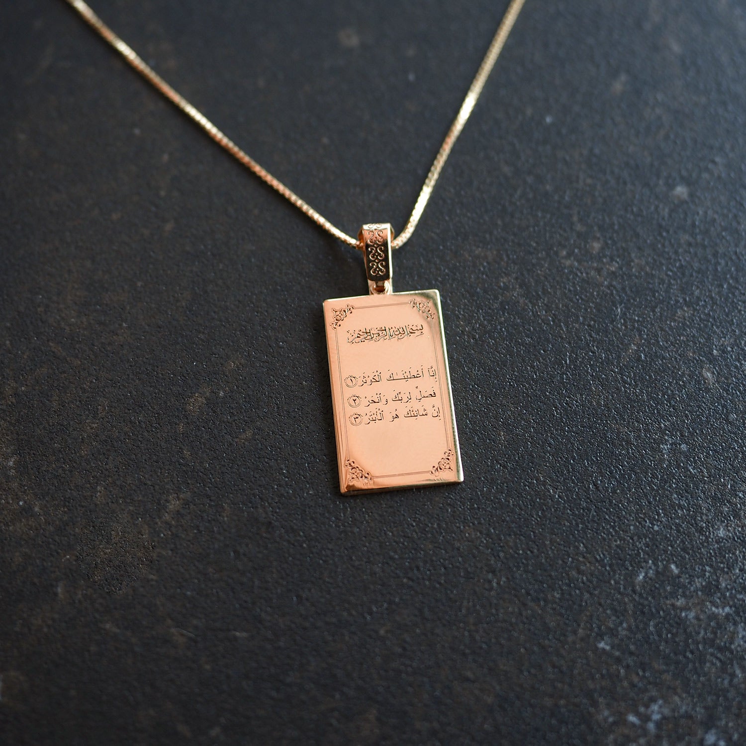 The Surah Al-Kawthar Necklace carries the Arabic verse of divine abundance — a message of eternal gratitude and grace.