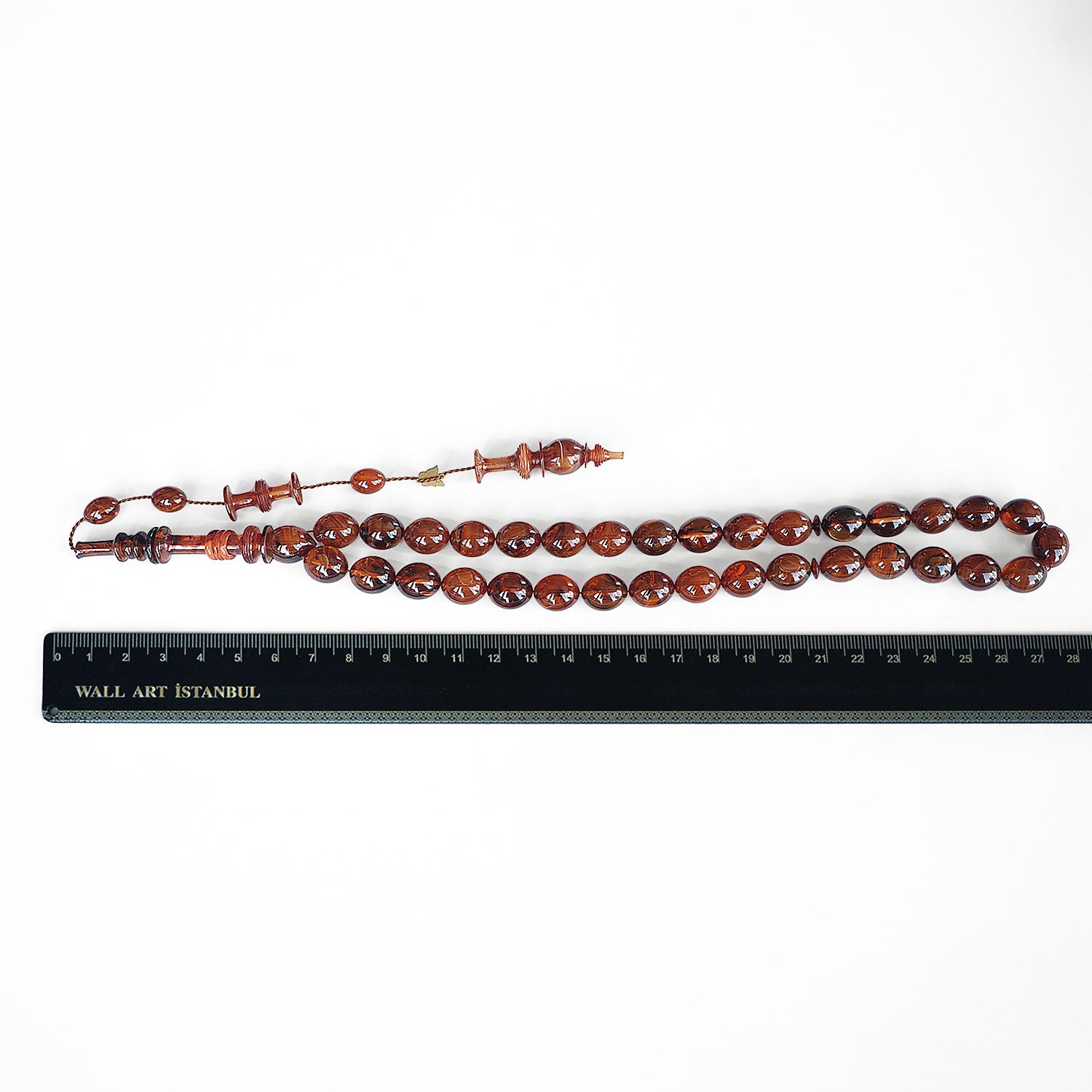 This handcrafted tasbeeh features custom cast Catalin 33 beads with a smooth oval form, offering a balanced presence that combines visual depth with a comfortable, flowing grip.